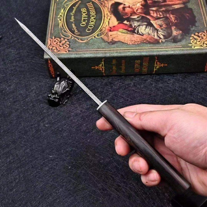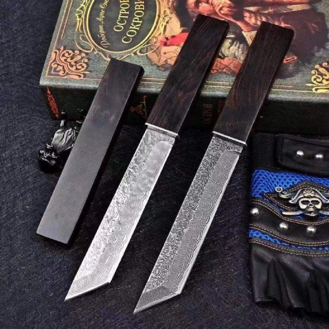One piece keel into the handle, the handle is ebony designed to go with the sheath one wood out! The grain is the same color! Heavy cost! Japanese samurai style! Total length: 25.6cm, blade length 14cm, blade thickness 4mm, blade width: 2.5cm, steel: forged Damascus steel VG10, 108 layers, hardness: 58-60/vacuum heat treatment, surface treatment: throw mirror effect! Handle material; imported ebony, sheath: ebony material!
