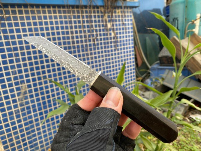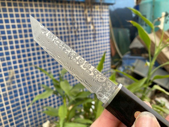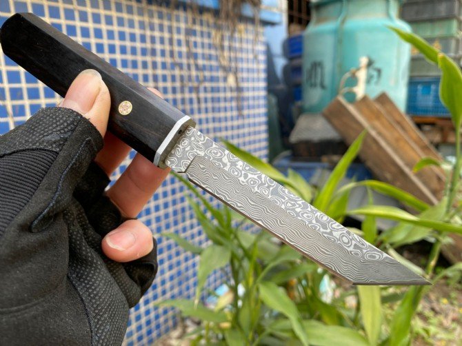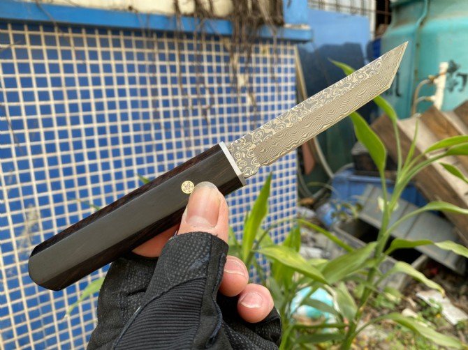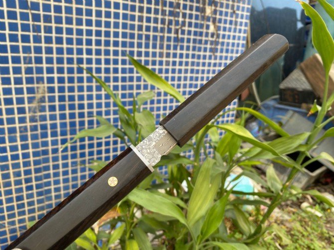 A popular domestic and international Japanese samurai style sword, the new version is made of Damascus steel, vacuum heat treatment, teacher second opening, very sharp, one-piece keel into the handle, the handle is made of ebony, the original wood one-piece handle feels great in your hand! The grain color is consistent! Hand sharpened!
